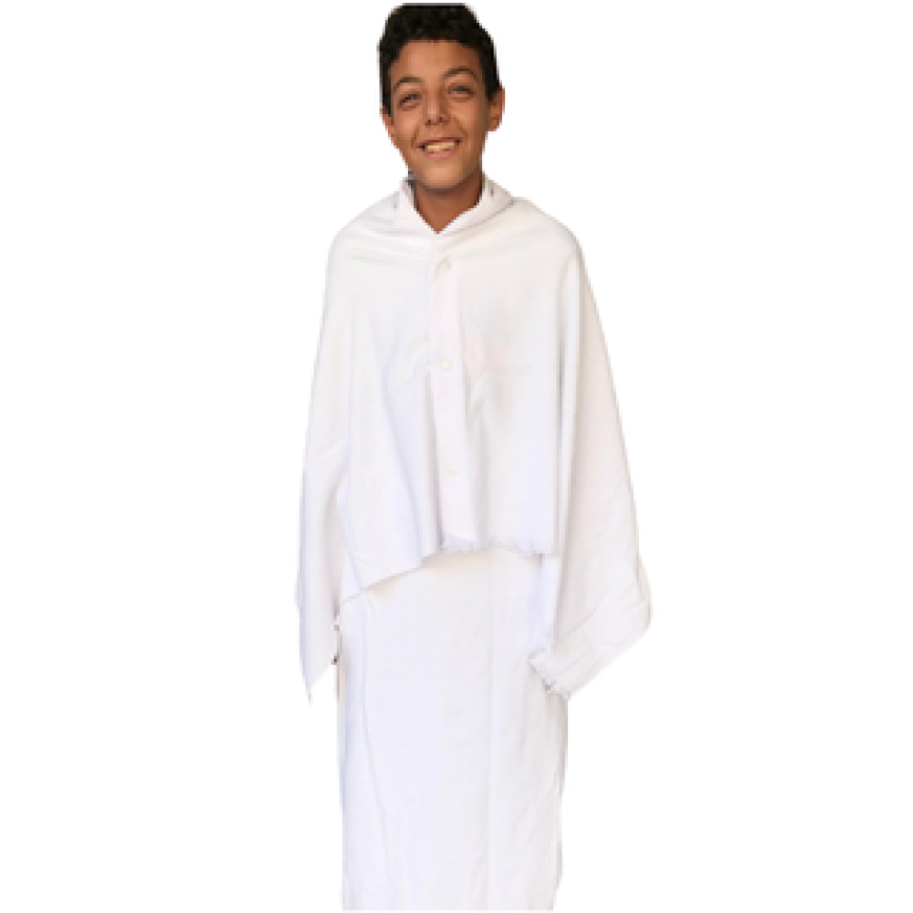إحرام لجميع الفئات العمرية من سن البيبي حتى سن الشباب مجهز بالكباسين يحتوي على قطعتين (إزار , روب) ويتميز بتصميم راقي وبالراحة أثناء تأدية مناسك الحج والعمرة